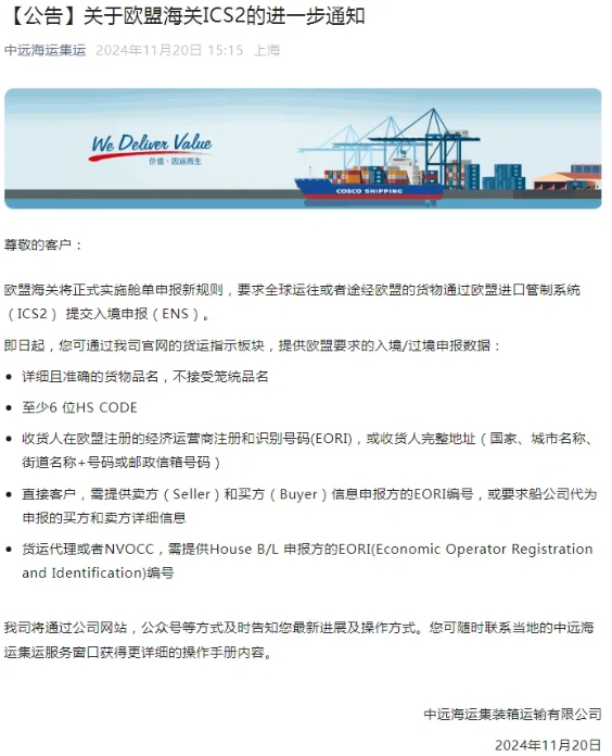 尊敬的客戶:歐盟海關(guān)將正式實施艙單申報新規(guī)則,要求全球運往或者途經(jīng)歐盟的貨物通過歐盟進口管制系統(tǒng) (ICS2) 提交入境申報(ENS)。即日起,您可通過我司官網(wǎng)的貨運指示板塊,提供歐盟要求的入境/過境申報數(shù)據(jù):