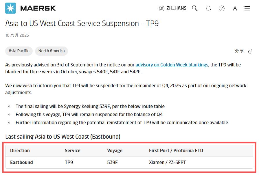 9月10日,馬士基發(fā)布最新通知稱(chēng),作為正在進(jìn)行的服務(wù)網(wǎng)絡(luò)調(diào)整的一部分,TP9 航線(xiàn)將在2025年第四季度剩余時(shí)間內(nèi)暫停運(yùn)營(yíng),最后一個(gè)航次為“Synergy Keelung 539E”。此次航行結(jié)束后,TP9航線(xiàn)將在第四季度剩余時(shí)間內(nèi)保持停航狀態(tài),關(guān)于該航線(xiàn)可能恢復(fù)的更多信息,馬士基將盡快公布。