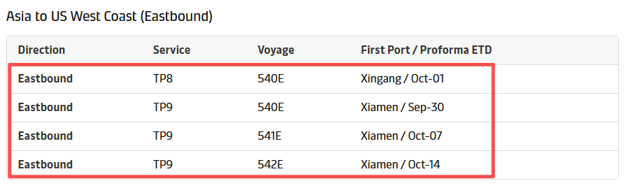 此前,馬士基發(fā)布公告,宣布將在十一黃金周期間調(diào)整航行計(jì)劃,具體措施包括對(duì)跨太平洋東行的TP8、TP9 和 TP11航線(xiàn)實(shí)施停航。為確保港口覆蓋,馬士基計(jì)劃在其他航次進(jìn)行補(bǔ)充備用???。按照原計(jì)劃,TP9航線(xiàn)將于10月份停航三周,涉及航次為540E、541E 和 542E。
